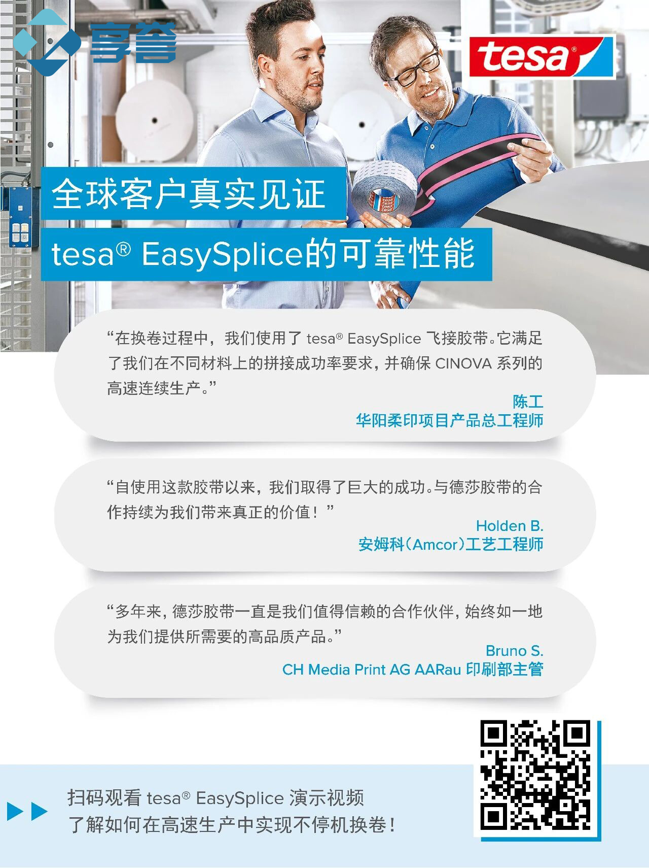 扫码观看tesa® EasySplice 演示视频,了解如何在高速生产中实现不停机换卷!
