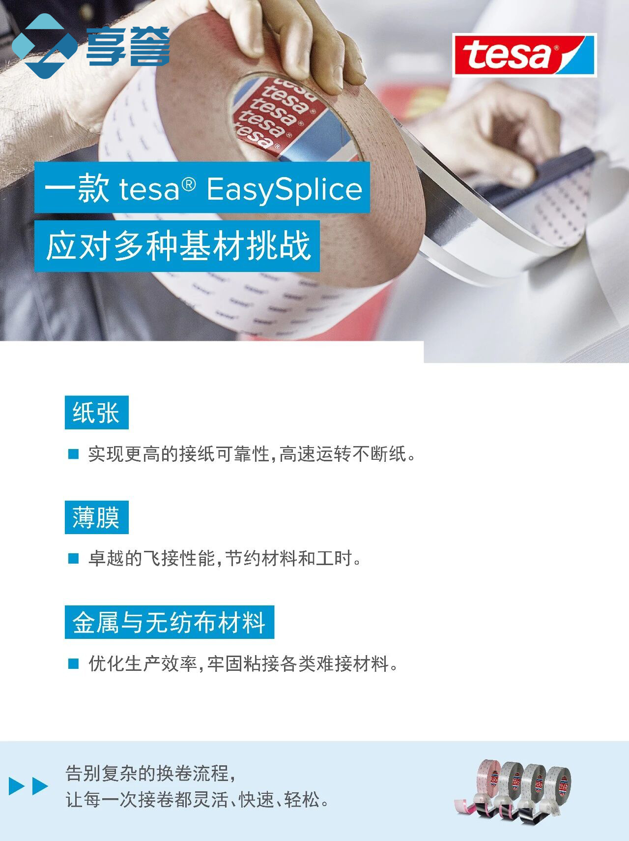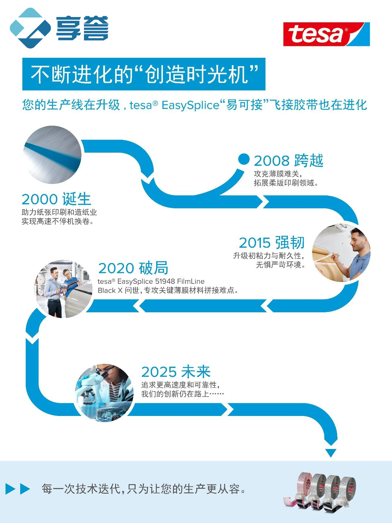 25年来,tesa® EasySplice“易可接”飞接胶带始终是您打造高效生产线的得力伙伴。我们提供的智能拼接系统,让纸张、薄膜、无纺布到金属箔的每一次换卷都变得灵活、快速、轻松。