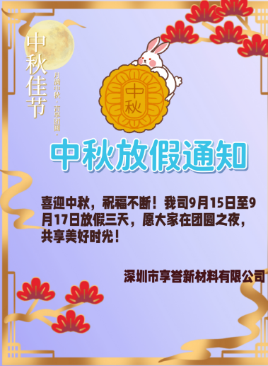 深圳市享誉新材料有限公司向每一位辛勤付出的员工及支持我们的客户致以最诚挚的谢意。愿这轮满月带去我们的祝福,中秋快乐,幸福安康!